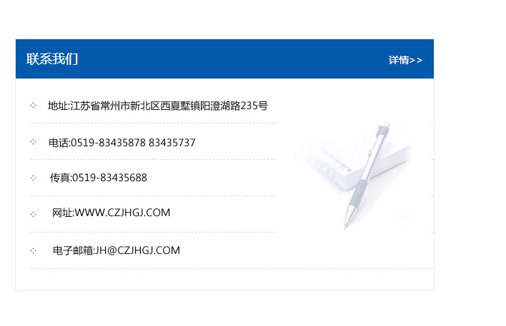 地址:常州市新北區友邦商務大廈1幢16、17層  電話:0519-85101652  傳真:0519-85112595  郵編:213022  網址:www_cz-jiayue_cn.pairidesign.com  郵箱:xiajifengaa@163.com